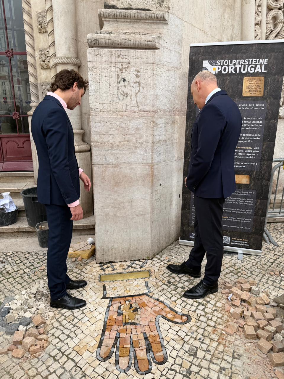 On 27 February 2026, the first Stolperschwelle in Lisbon and in Portugal was installed next to Rossio Station, dedicated to the memory of the refugees who passed through the city while fleeing Nazism. The ceremony was attended by Diogo Moura, Councillor for Culture of Lisbon City Council, the Ambassador of Israel to Portugal, Oren Rozenblat, and João Taborda da Gama, National Coordinator of the European Strategy to Combat Antisemitism and Foster Jewish Life. Executed by master stone paver Luís Pereira, this installation represents the result of nearly five years of persistent work, marked by obstacles, refusals, and resistance that only confirmed the need for this project in Portugal. Conceived and brought to the country by Luciano Waldman, the project was developed through the work of the Centro Cultural Rua da Judiaria and became a reality thanks to institutional persistence, the support of partners, and the contributions of all those who believed in it, supported it, and donated so that this memory could take its place in public space.